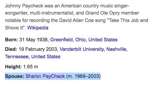Sidenote: I really enjoyed seeing who Johnny Paycheck was married to …